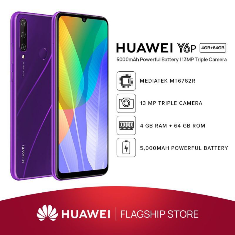 HUAWEI Y6p - HUAWEI Global . 5000mAh Powerful Battery 1 13MP Triple Camera 2 . 64GB Large Storage 3 . 6 .3" Dewdrop Display . The 6 .3" Dewdrop Display 4 with an 88 .4% screen-to-body ratio provides a wide and immersive visual experience . 5 With a diameter of 2 .65 mm, the tiny and discreet front camera with a narrow frame achieves more room to . . .
