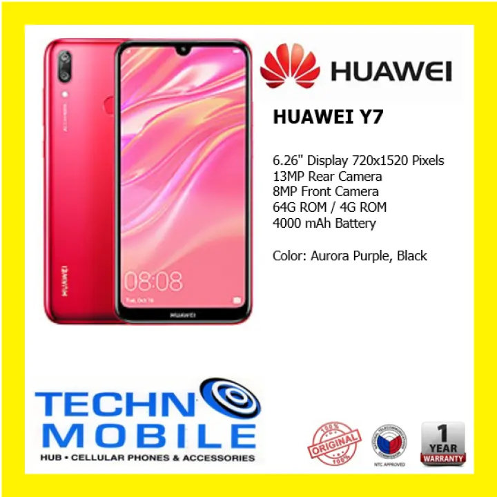 Huawei Y7 (2019) Android smartphone . Announced Mar 2019 . Features 6 .26″ display, Snapdragon 450 chipset, 4000 mAh battery, 64 GB storage, 4 GB RAM .