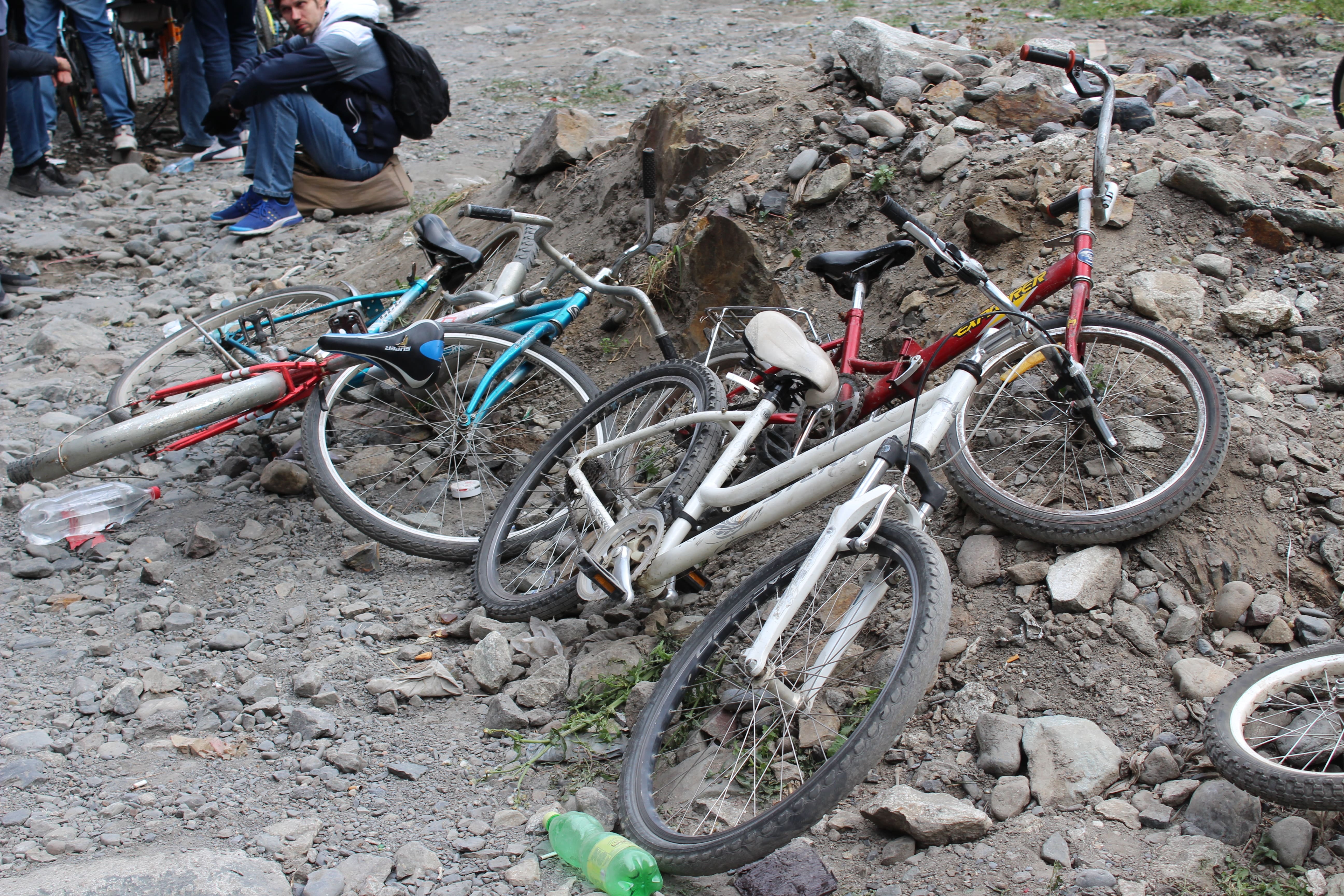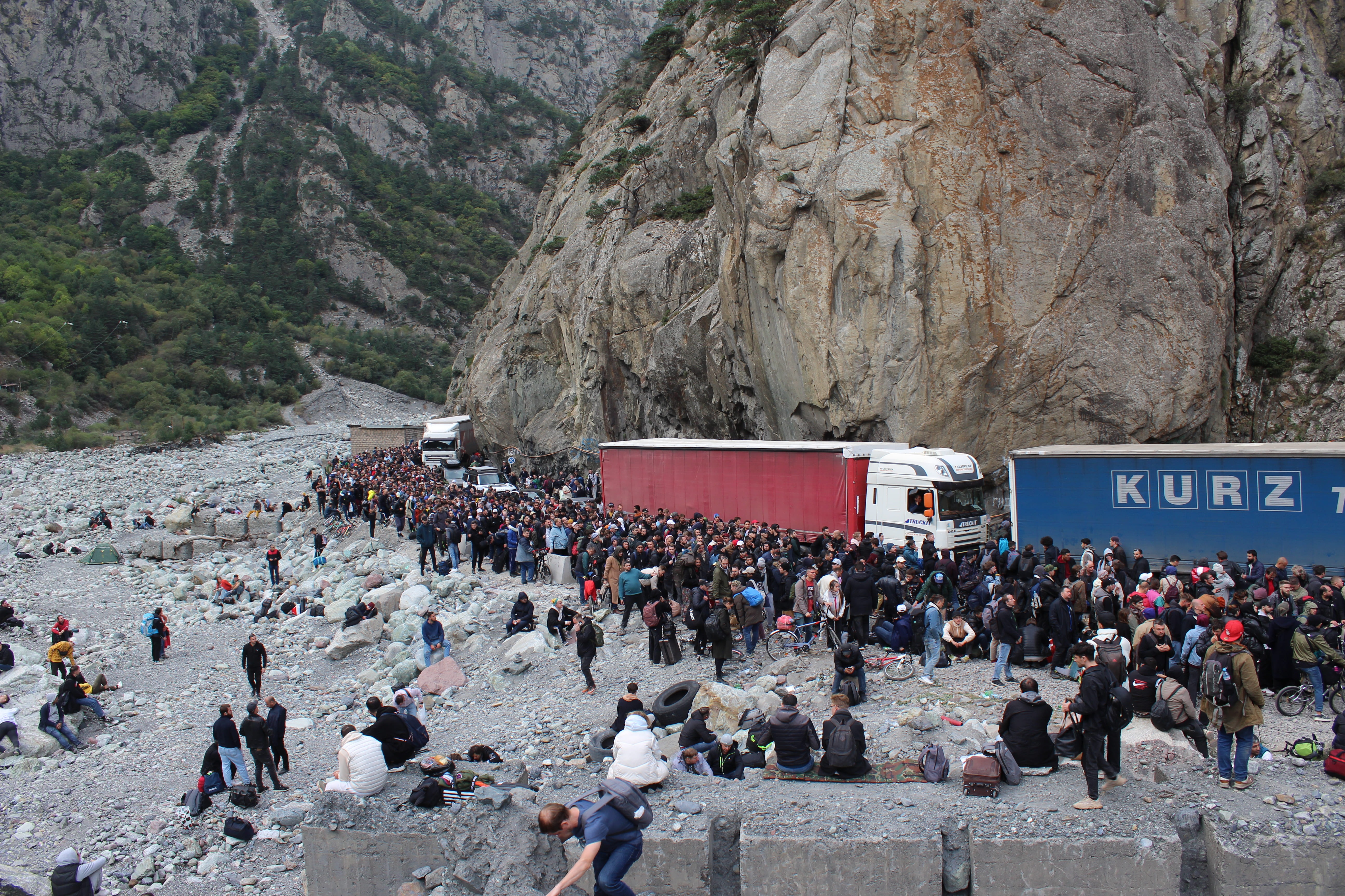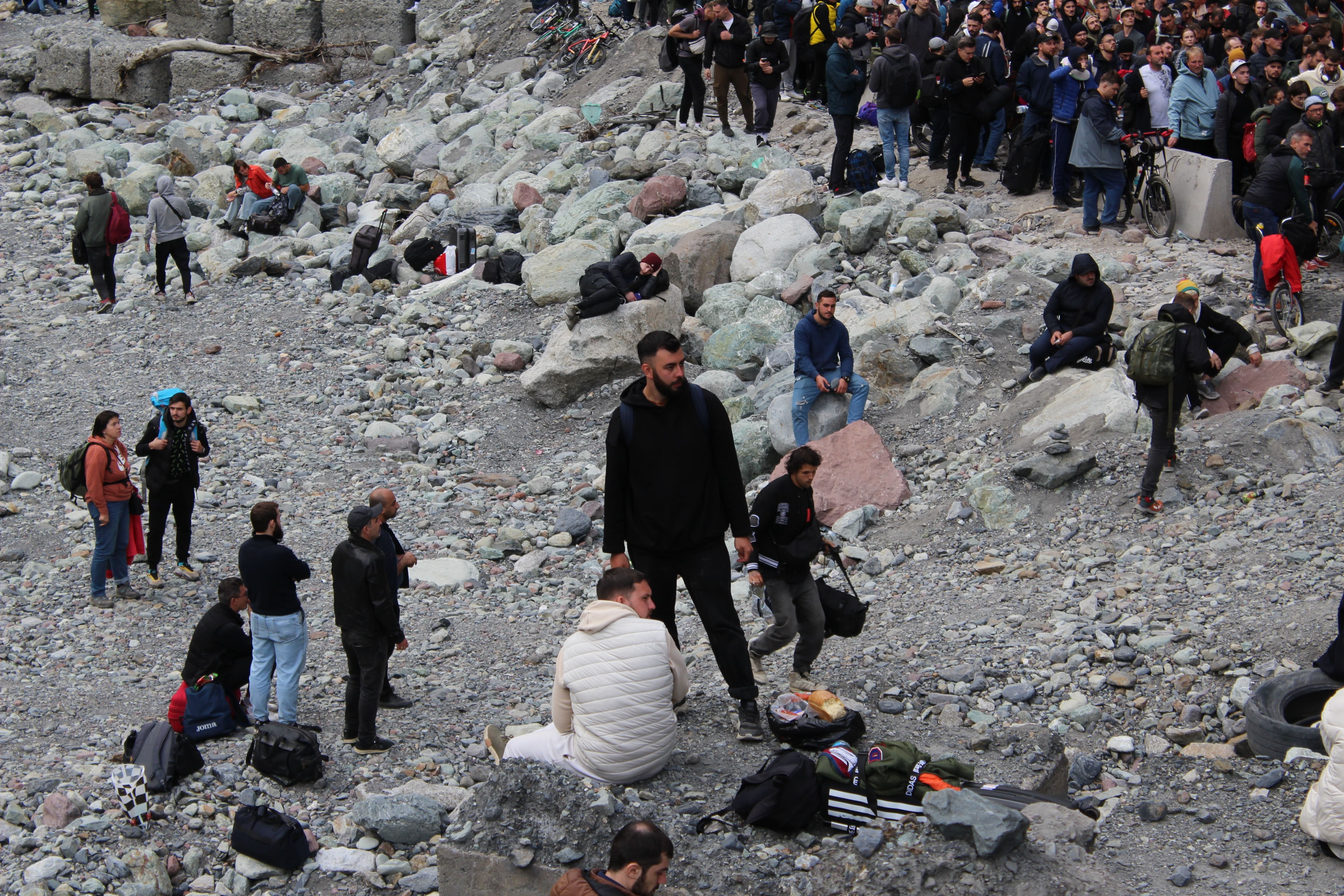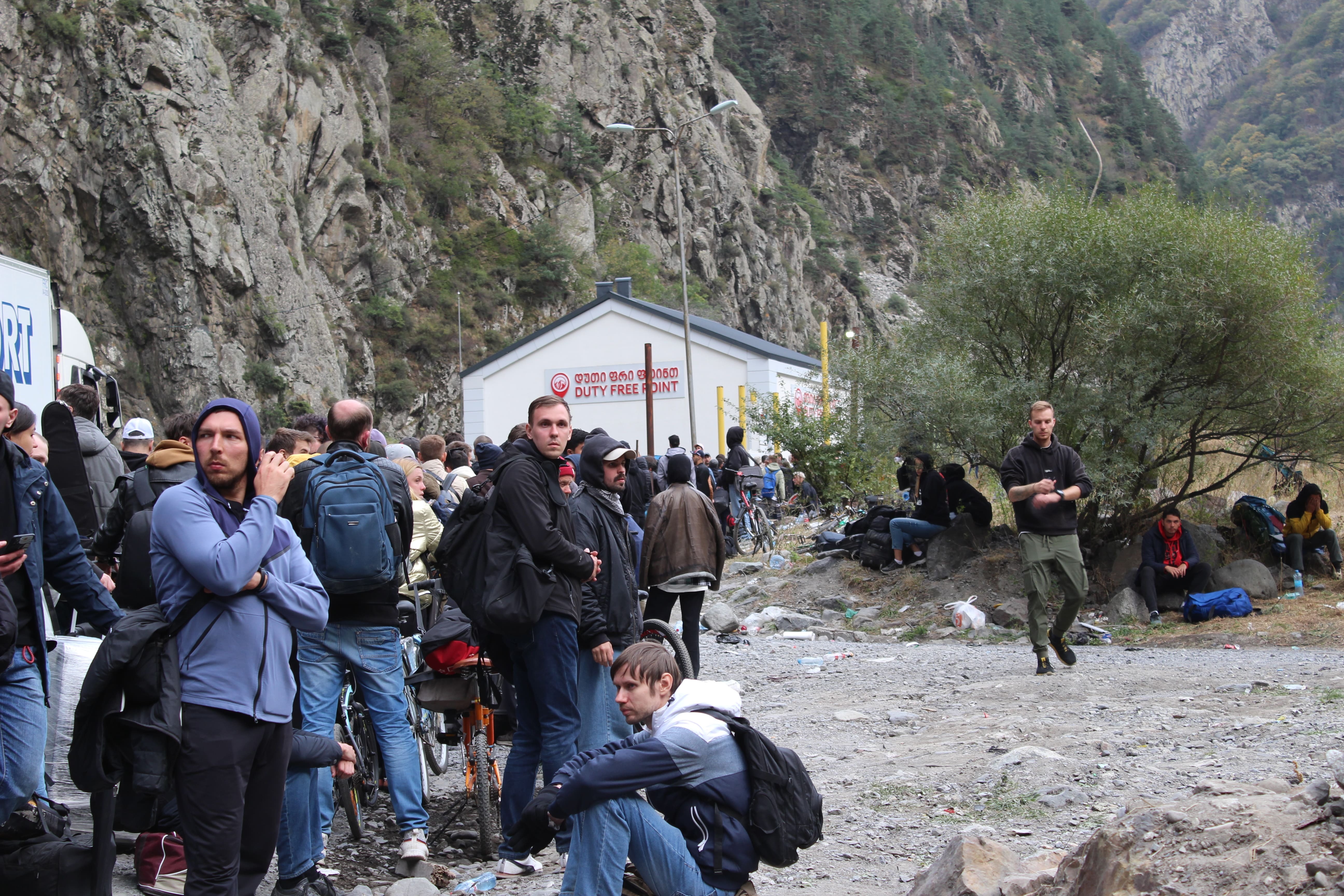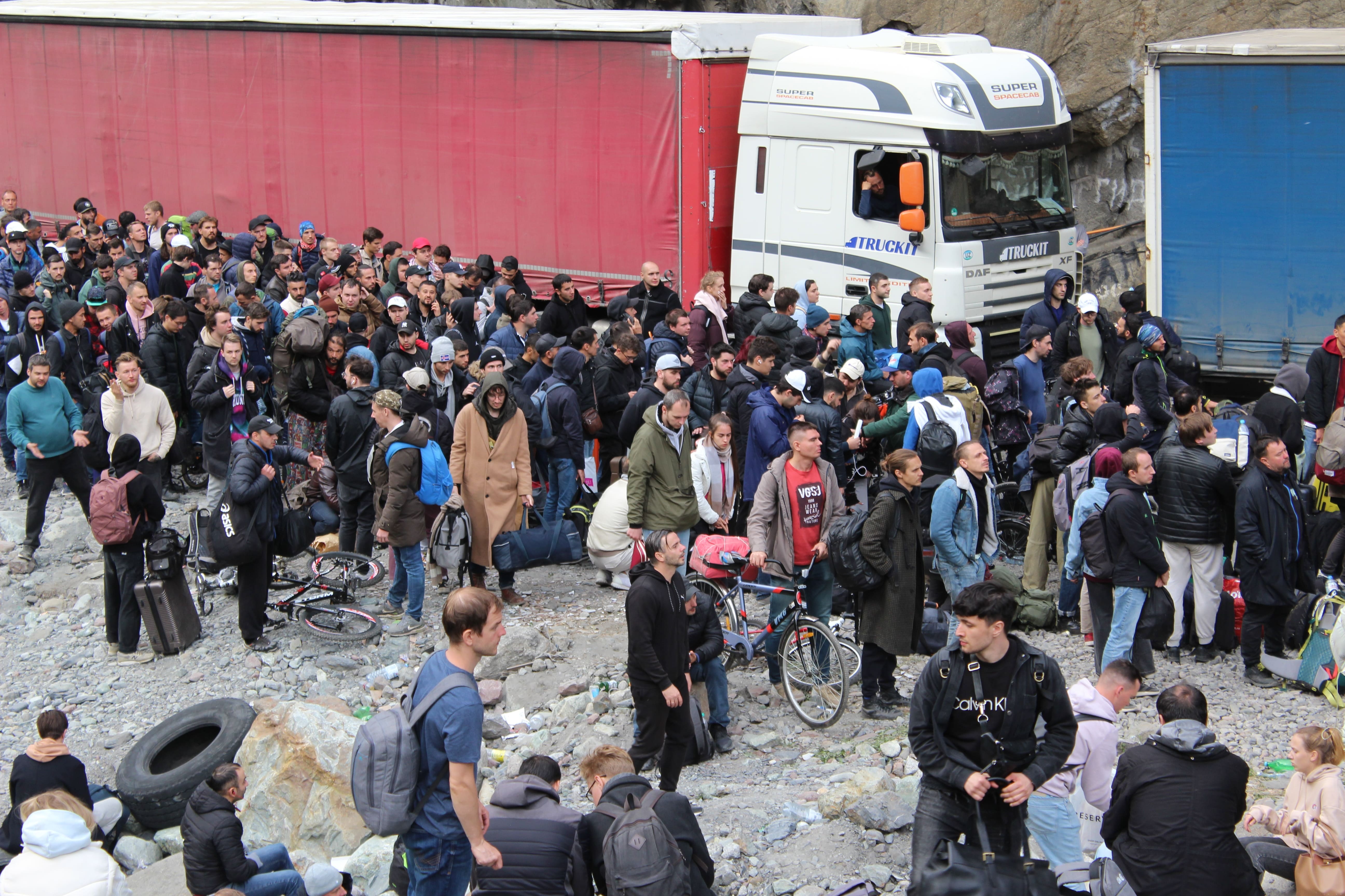 Примерно 5 километров мы шли под палящим солнцем вдоль, казалось, бесконечной очереди из машин, велосипедов, мотоциклов и пешеходов. Люди в отчаянии меняли дорогие иномарки на старенькие велосипеды, которые выбрасывали после пересечения границы, а кто-то просто оставлял машины и шёл пешком, надеясь успеть пересечь границу до закрытия. У многих уже не было еды и воды, но я не видел ни одного человека, который развернулся бы и поехал обратно — все понимали, что ждёт их в России.