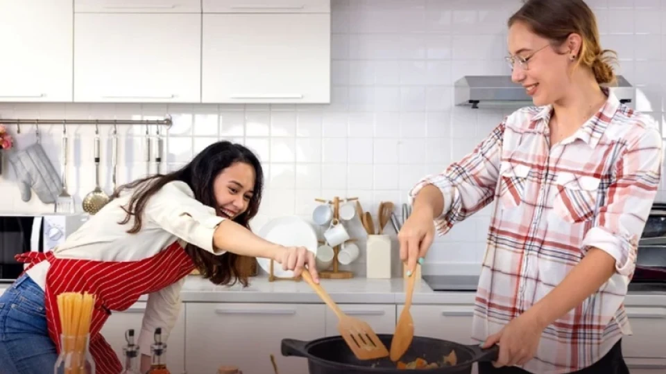 Hungry Girls Making Each Other Relax Inside Kitchen