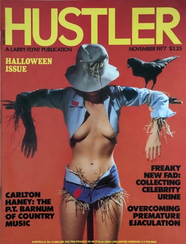 November 1977 Issue Hustler Halloween Issue Profile "Carlton Haney the P .T . Barnum of Country and Western" by John Pugh . Features "Overcoming Premature Ejaculation" by Chris Cassel . "Men's Rights -- Two Balls, Two Strikes" by Jonathan Black . "Showered by Howard" by Jay Lynch .