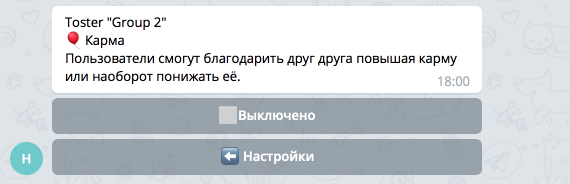 Нажмите на кнопку ⬜️Выключено в положение ☑️Включено, чтобы активировать Карму в вашей группе. На этом настройка завершена, возможно в будущем здесь появятся другие опции.