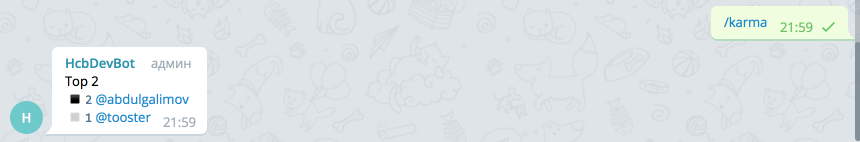 Как видно пользователь @abdulgalimov имеет карму 2, а @tooster - 1. Карма может быть и отрицательной. Если вы хотите увидеть карму определенного пользователя - напишите команду /karma в ответ на сообщение этого пользователя.