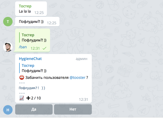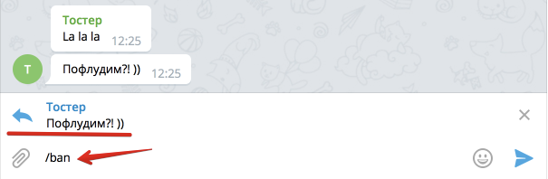 Чтобы коллективно забанить пользователя, в ответ на сообщение пользователя, кого вы хотите забанить, напишите команду /ban:
