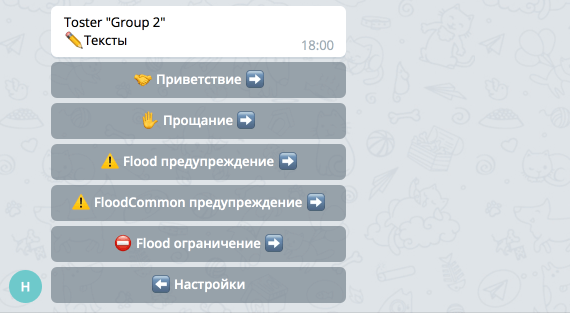 ⚠️Flood Предупреждение - текст который бот напишет пользователю в момент вынесения предупреждения за флуд(большое количество сообщений). Если текст не задать - бот напишет текст по умолчанию.
