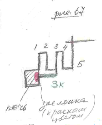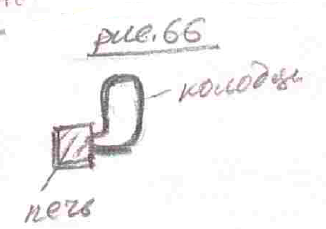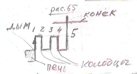 Поступали очень просто, то есть размещали колодцы не по длине (рис.65), а то есть заметьте, прохождение дыма, как прохождение трубы, то есть тяга увеличивается. При этом труба всегда должна выходить над коньком, над вершиной. Они размещали эти колодцы в круг. Вот у нас печка (рис.66)
