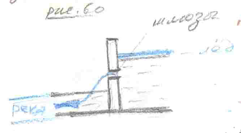 Многие говорят: Ну, как это может пригодиться сейчас? Да, очень просто: также запруда делается, только вместо мельницы ставится, допустим, генератор. И генератор турбины, вода течёт подо льдом, вращает турбину. Турбина выдаёт ток. Ведь принцип гидроэлектростанции так же построен. И заметьте, плотина, кремлевки, уровни, то есть вот у нас гидроэлектростанция перегородила уровень реки (рис.60).