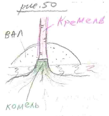 Тараном или еще чем-то, можно? Нет. Ничем не расшатаете. А почему? Потому, что определённая структура. Поэтому данную систему наши Предки взяли за основу для построения кремля, т.е. охранной системы. Когда делался вал, создавали кремль, т.е. либо оставляли деревья, которые вообще росли на месте, и между ними устраивали изгородь, забор, либо выкапывали деревья со всей землёй и их пересаживали рядом, и потом ещё делали вал, насыпали, т.е. укрепляли как столб (рис.50).