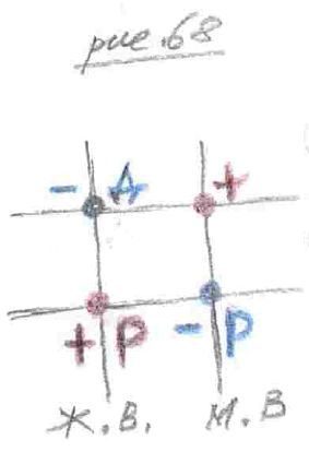 А лакомиться грибами, ягодами, животное ходит к другой точке. К плюсовой. Вот здесь, к примеру, у нас в минусовой точке (рис.68) дерево растёт. А дерево, как правило, какое? Причём тут осина? В минусовой точке медведь, он об здоровое дерево не чешется. То есть, здесь дерево, как правило, такое покорёженное, либо говорят: «Об разломанное дерево». С виду не стройное дерево, а больное.