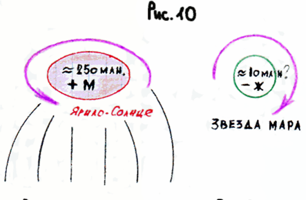 Но заметьте, наше Ярило – солнце (красный круг на рис.10), а здесь Звезда Мара (зеленый круг). Значит, здесь, у Ярило - солнца какая сила? Положительная и одновременно - мужская. А у Звезды Мара – сила противоположная и женская. Так что будет при сближении? Энергии-то они притягиваются друг к другу. Если, когда (вместо Звезды(?)) Солнце проходит, энергии взаимо отталкиваются, как два плюса. Т.е. влияния по идее должны быть, но они минимальны. А здесь – максимальны, потому что мало того, что это (Звезда Мара(?)) – белый гигант, а не белый карлик. Да, нет, здесь не плюс и минус, здесь не математика, а здесь положительная – мужская и противоположная – женская, они притягиваются, как магниты, притяжения магнитных полей, приближение мужского к женскому.