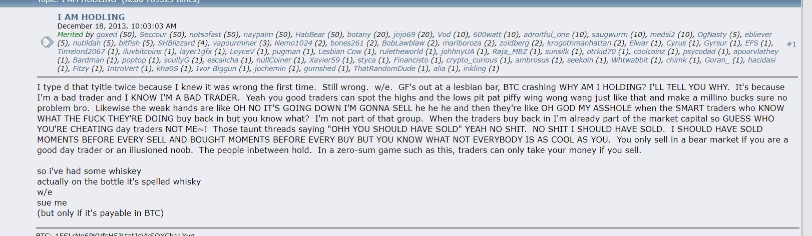 Пост автора термина HODL за 18 декабря 2013 года.