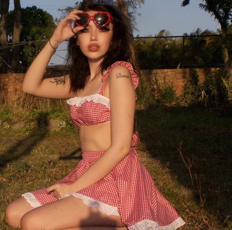 Vera Mill su raudonu maudymuku wearing red swimsuit