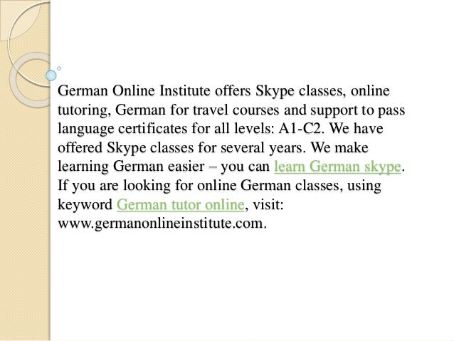 9. German Online Institute offers Skype classes, online tutoring, German for travel courses and support to pass language certificates for all levels: A1-C2. We have offered Skype classes for several years. We make learning German easier β you can learn German skype. If you are looking for online German classes, using keyword German tutor online, visit: www.germanonlineinstitute.com.