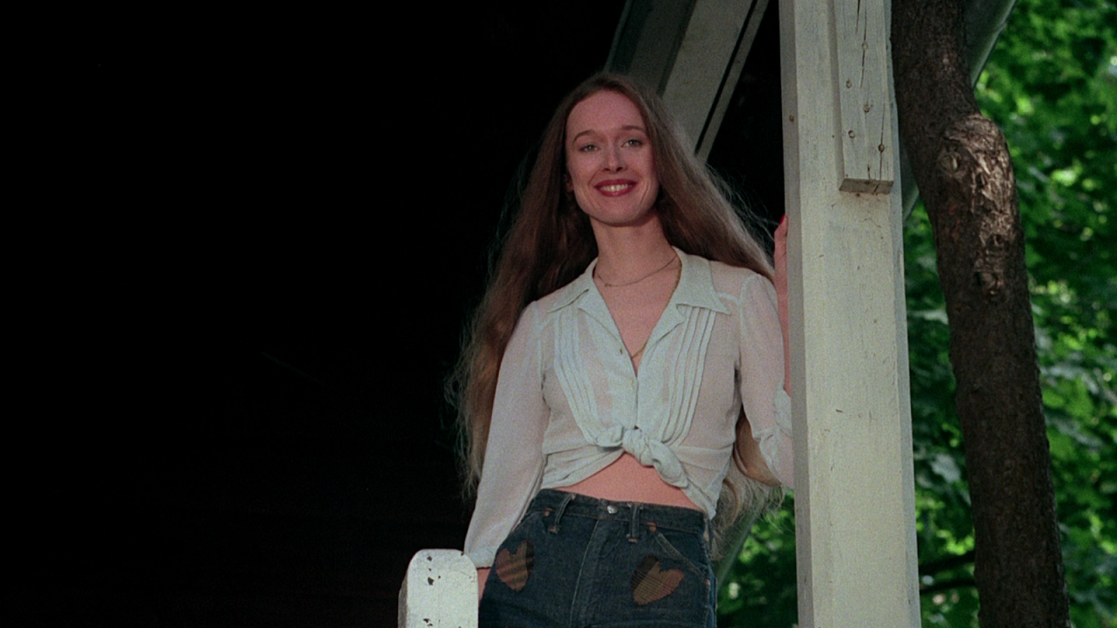 While Jennifer is torturing Stanley and zooms the camera and says "Smile pretty for the camera," someone is visible behind Stanley behind the trees.