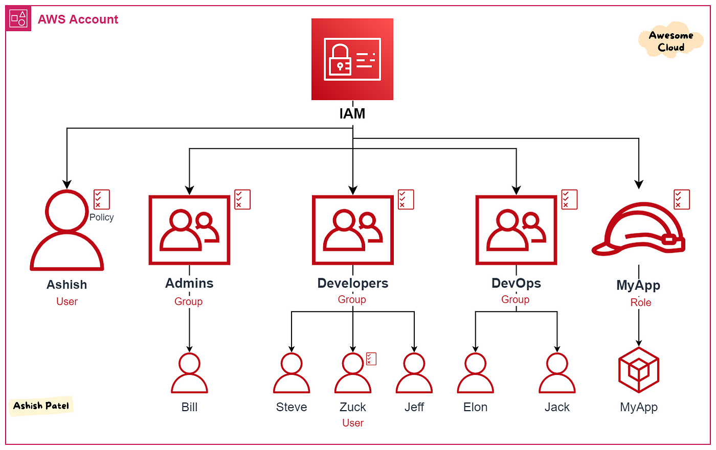 По традиції почнемо з абревіатури. IAM походить від Identity and Access Management (Служба Ідентифікації та Управління Доступом). Цей сервіс відповідальний за дозволи на створення та внесення змін до ресурсів у вашому аккаунті AWS як користувачами, так і іншими ресурсами. Також за його допомогою ви маєте змогу створювати користувачів, поєднувати їх у групи та надавати певні повноваження як групам, так і певним користувачам окремо. Тепер нумо розбиратись, що за що відповідає.