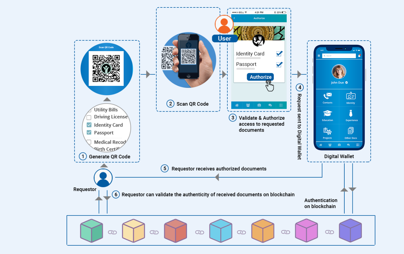 - Авторизованные документы вместе с блокчейн-аутентификацией для каждого из них теперь передаются с цифрового кошелька пользователя на устройство запрашивающего.