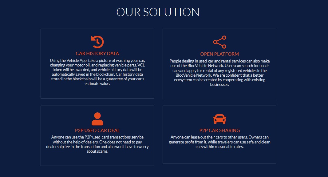 The goal of the BlocVehicle venture is to create a true commercial service platform for used vehicles that will provide a transparent P2P system with next-generation automotive maintenance data. In addition, BlocVehicle hopes to showcase a shared economy in the automotive industry.