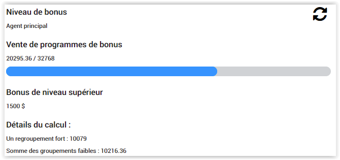 Dans mon exemple, le chiffre d'affaire de ma jambe faible est de 10079, il faudrait donc que le chiffre d'affaire de ma jambe faible soit au moins égale à 10079 / 2 soit 5039.5