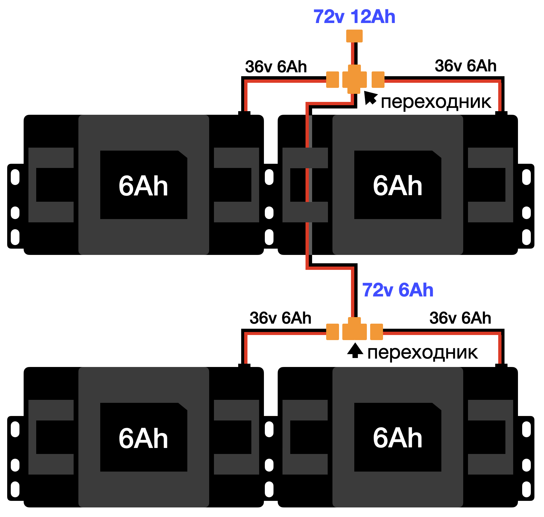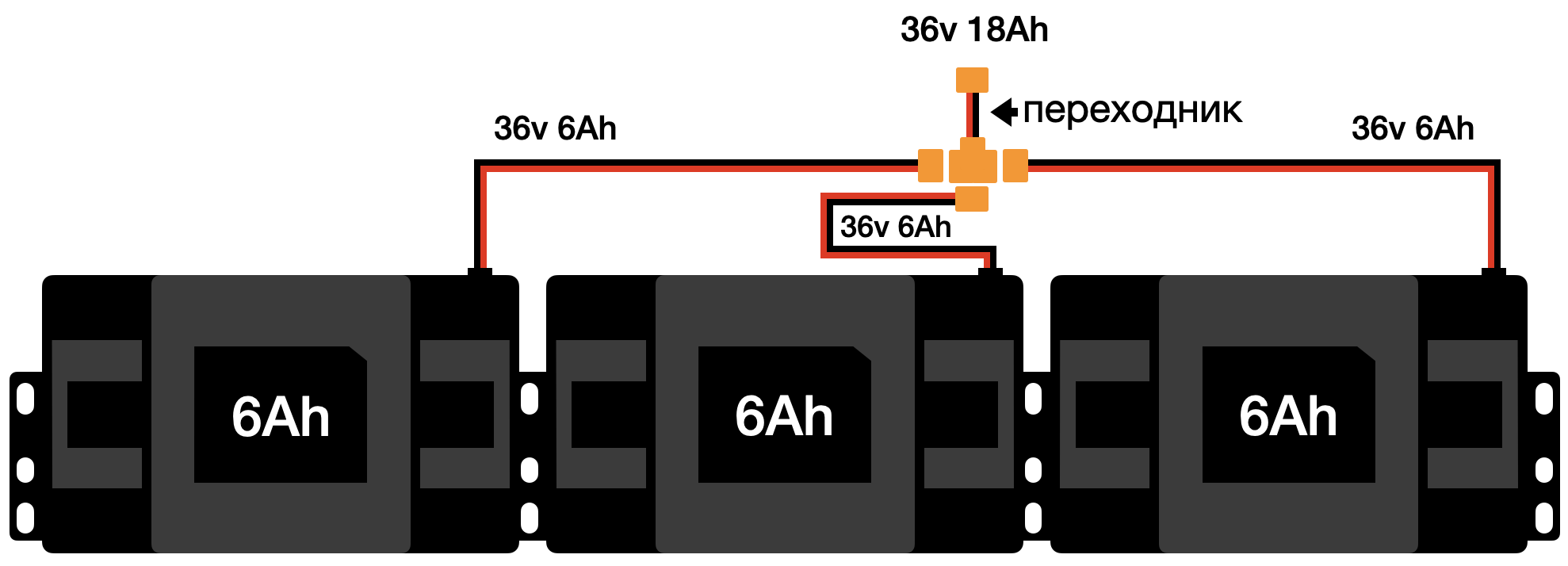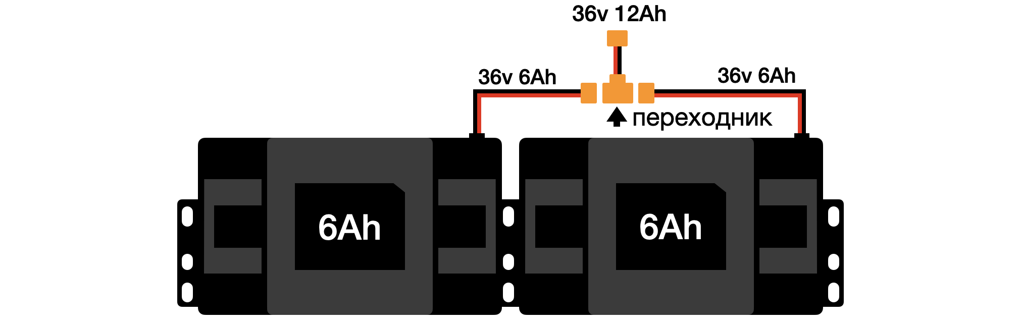 Параллельное подключение позволяет увеличить емкость аккумулятора, следовательно повысить мощность мотора, скорость и пробег в км