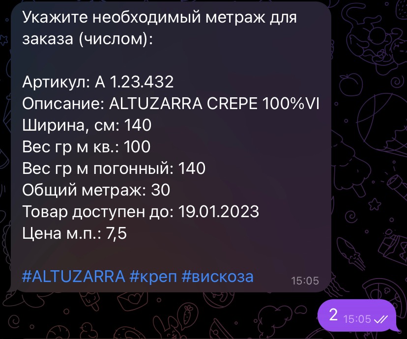 Программа перекидывает вас в чат, где бот предложит ввести желаемый метраж и отобразит наличие.