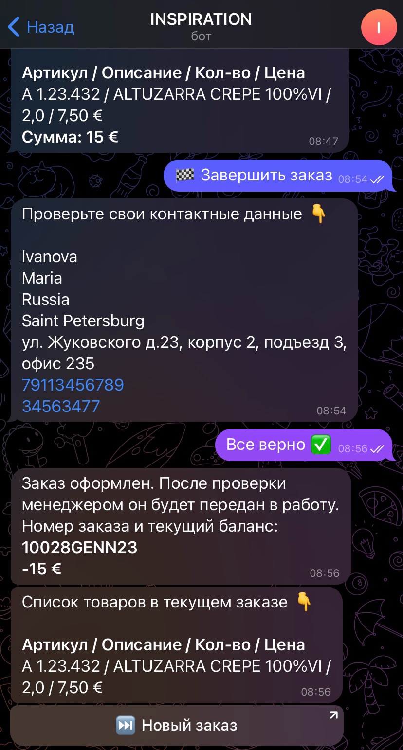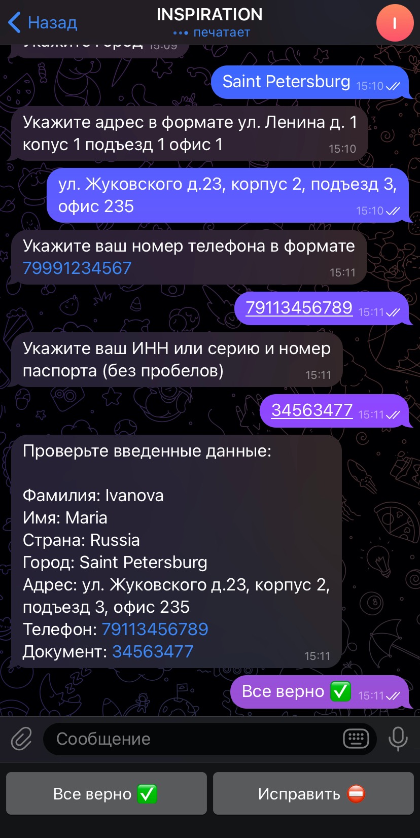 Введите все данные (ФИО адрес и контакты куда отправится груз на латинице), последовательно отвечая на вопросы бота.