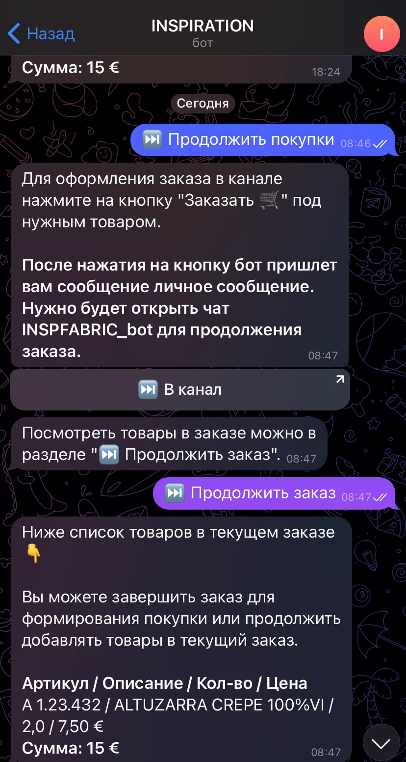 5. После указания и проверки метража по конкретной позиции, для дальнейшей покупки, можно переходить в канал для добавления следующих позиций через кнопку «ПРОДОЛЖИТЬ ЗАКАЗ» и «В КАНАЛ»