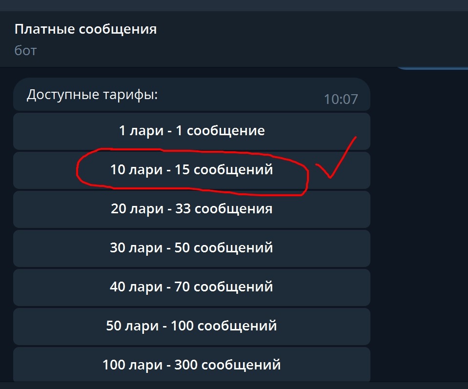 ВЫБЕРИТЕ ТАРИФ ЛЮБОЙ ТАРИФ НАПРИМЕР 10 ЛАРИ - 15 СООБЩЕНИЙ