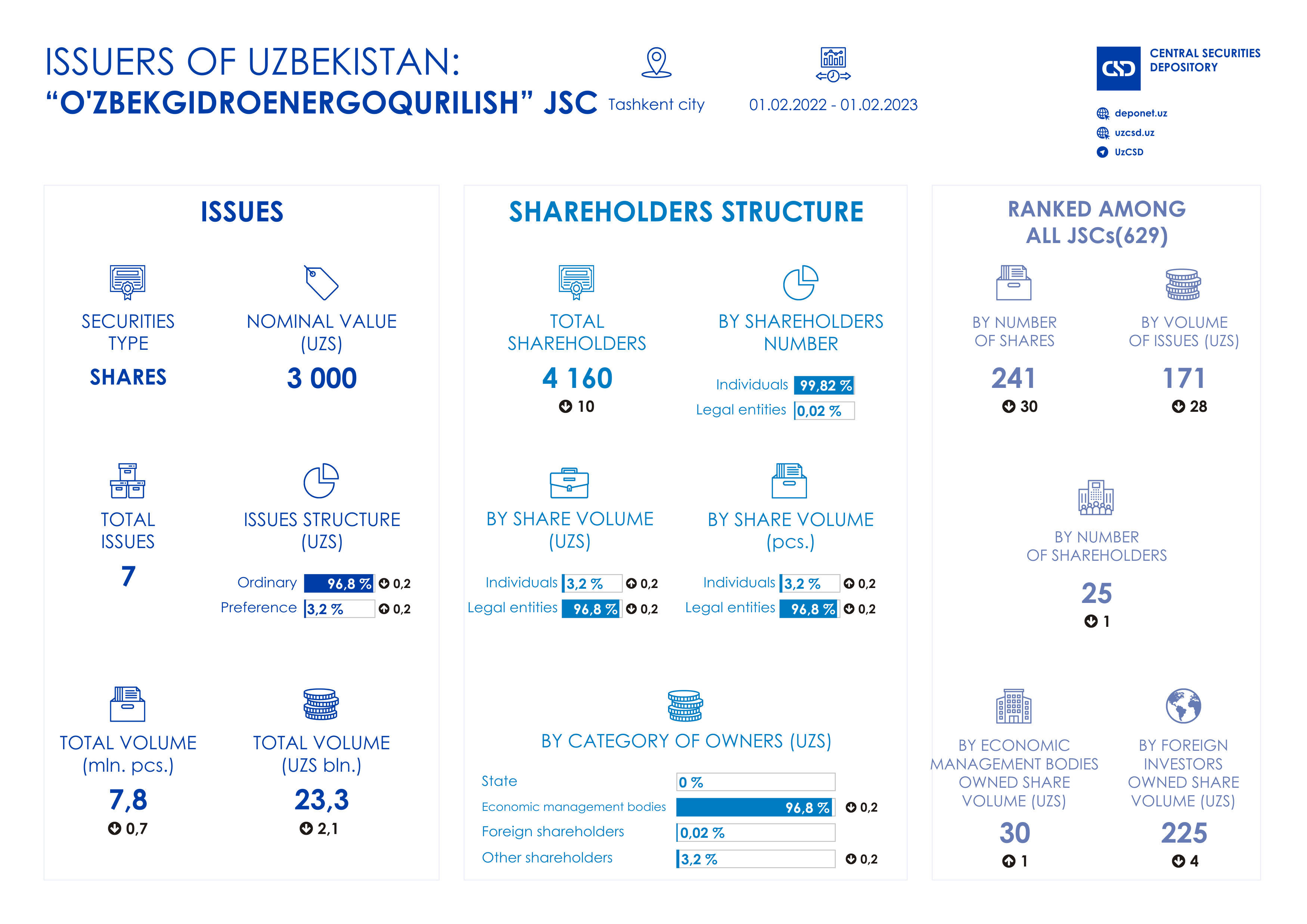 ▶️ the total volume of shares issues in monetary terms decreased by 2.1 UZS billion and amounted to 23.3 UZS billion;