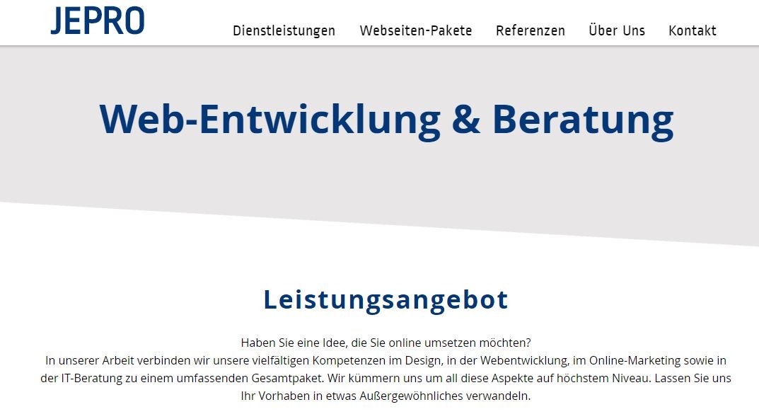 Haben Sie eine Idee, die Sie online umsetzen möchten? In unserer Arbeit verbinden wir unsere vielfältigen Kompetenzen im Design, in der Webentwicklung und Online-Marketing zu einem umfassenden Gesamtpaket. Wir kümmern uns um all diese Aspekte auf höchstem Niveau. Lassen Sie uns gemeinsam Ihre IT-Landschaft und ihren Webauftritt in etwas Außergewöhnliches verwandeln.Wenn Sie das Interesse und die Aufmerksamkeit Ihrer Zielgruppe wecken möchten, ist ein ansprechendes Corporate Design unerlässlich. Die umfangreichen Leistungen von der Jepro Service GmbH im Bereich Corporate Design leisten einen entscheidenden Beitrag dazu, ihr Firmenimage zu gestalten. Vom ersten Designkonzept bis zum Endergebnis setzen wir alles daran, Ihre Vision auf professionelle Weise umzusetzen.Dientsleistungen und Produkte mit Bild, Video & Grafik visuell anzupreisen und hervorzuheben, ist in der heutigen Zeit unerlässlich. Unsere professionellen Photografen und Grafikdesigner platzieren Ihre Dienstleistung und Produkt im besten Licht. Die Jepro Service GmbH bietet unterschiedliche, auf auf Ihre Bedrüfnisse abgestimmte Dienstleistungspakte im Bereich Bild, Video & Grafik an.