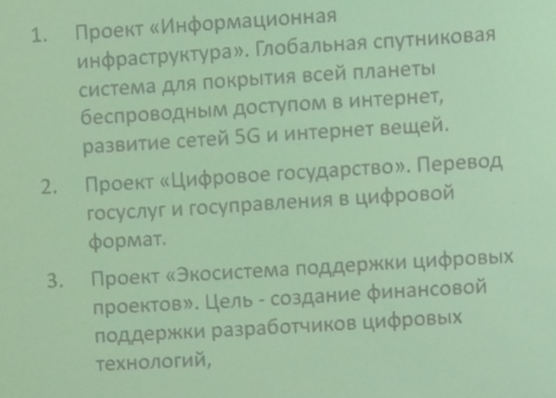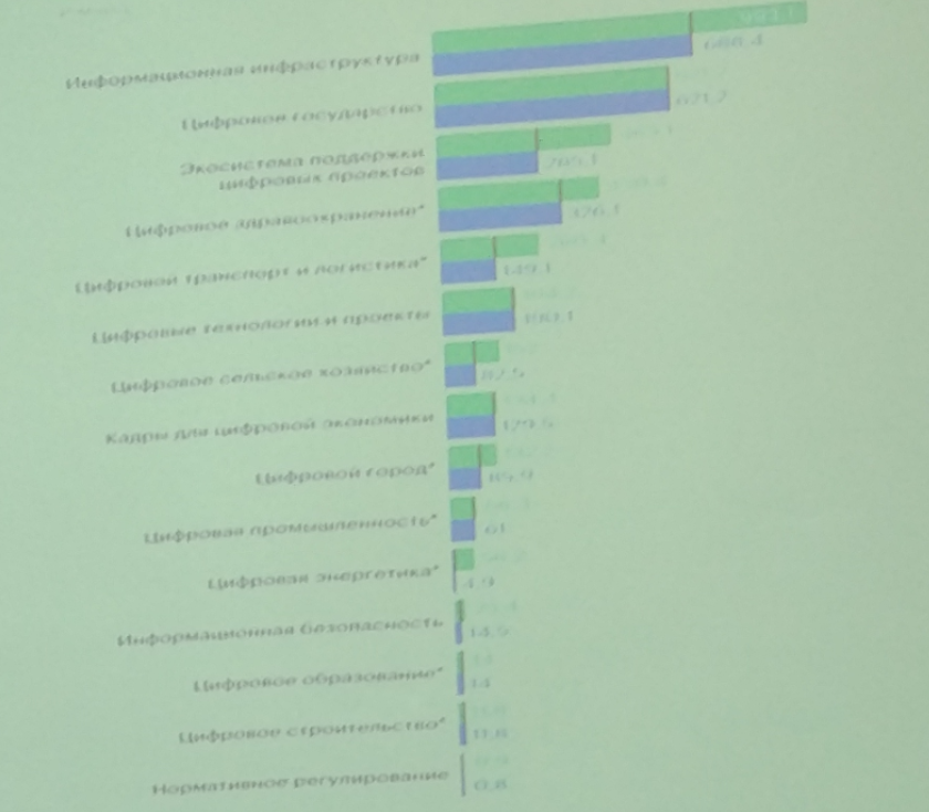 Информационная инфраструктура, цифровое государство, экосистема поддержки цифровых проектов, цифровое здравоохранение, цифровой транспорт и логистика, цифровые технологии и проекты, цифровое сельское хозяйство, кадры для цифровой экономики, цифровой город, цифровая промышленность, цифровая энергетика, информационная безопасность, цифровое образование, цифровое строительство, нормативное регулирование.