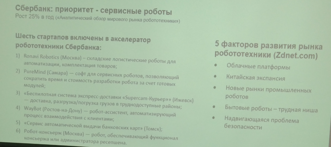 У Сбера огромная потребность в робототехнике, за счет большого количества однообразных операций. Рассказали про кейс, где для Сбербанка были разработаны специальные роботизированные аппараты для пересчета денег, которые позволили сократить штат в несколько раз, тк раньше на выполнение этой операции требовалось 3 человека, теперь остался 1 контролер.