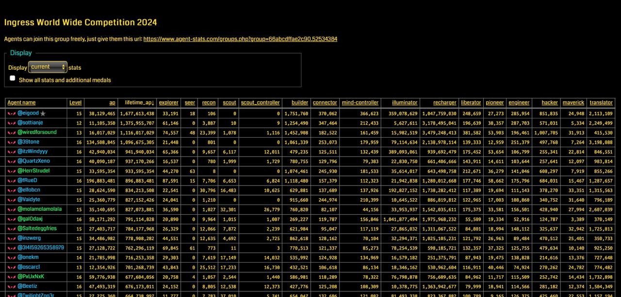If everything worked, you should now see a list of agents, sorted by Lifetime AP descending (for see all stats select "Show all stats and additional medals") :
