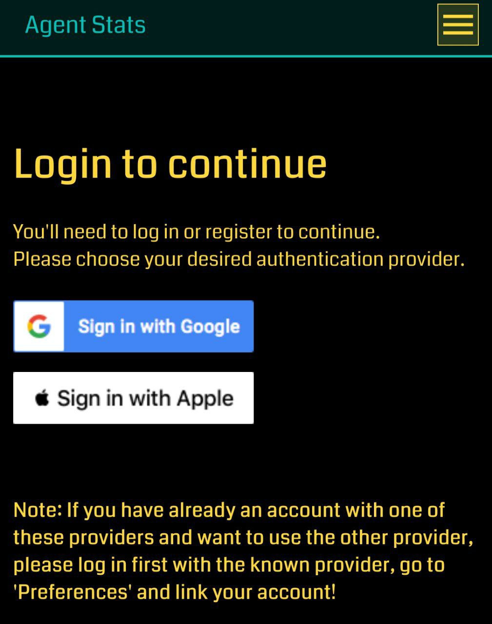 You will be given the choice to either use a Google or an Apple account to create your Agent Stats account. The account used does not need to match the one you use in Ingress. Facebook accounts are not supported!