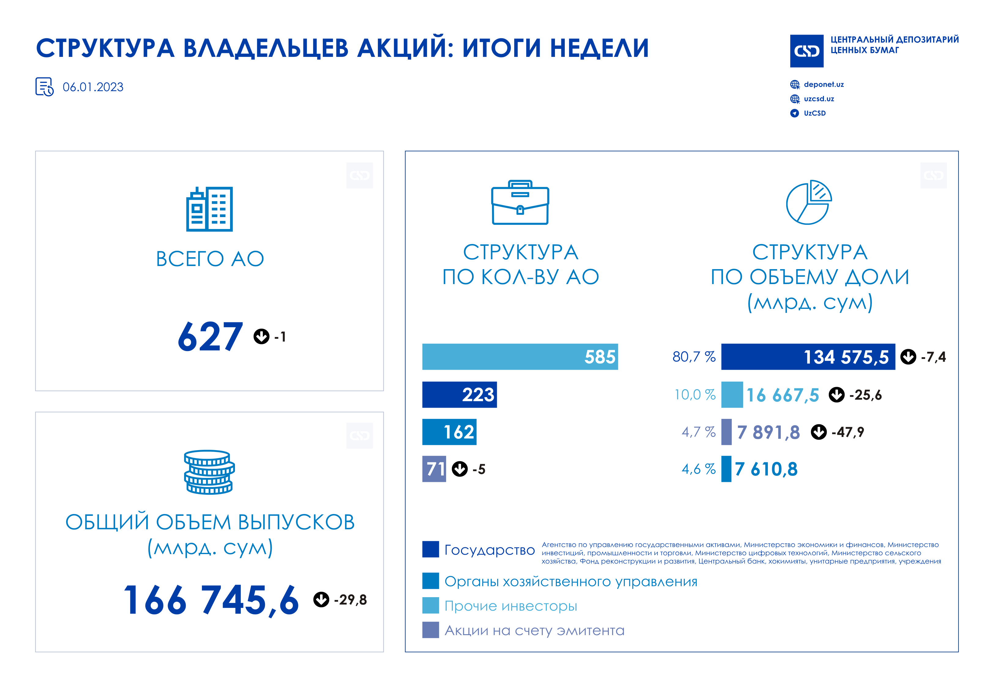 По состоянию на 06.01.2023 г. количество АО составило 627. Общий объем выпусков акций составил 166 745,6 млрд. сум.