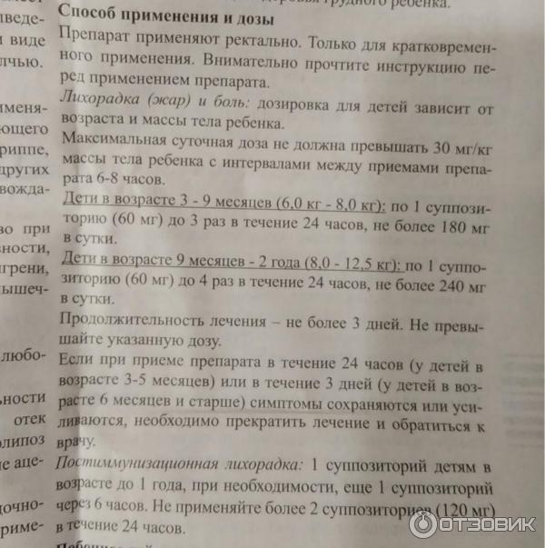Разовая доза составляет 5-10 мг/кг массы тела ребенка 3-4 раза/сут . Максимальная суточная доза не должна превышать 30 мг на кг массы тела ребенка в сутки . Дети в возрасте 3-9 месяцев (5 .5 кг-8 .0 кг): по 1 суппозиторию (60 мг) 3 раза в течение 24 ч через 6-8 ч, не более 180 мг/сут .