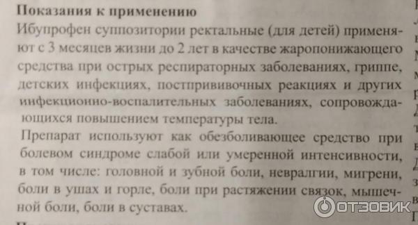 Ибупрофен суппозитории ректальные (для детей) применяют с 3 месяцев жизни до 2 лет в качестве жаропонижающего средства при острых респираторных заболеваниях гриппе детских инфекциях постпрививочных реакциях и других инфекционно-воспалительных заболеваниях сопровождающихся повышением температуры тела .