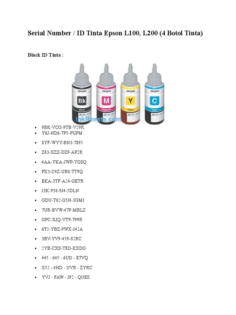 Подборка серийных номеров для Epson L800 . Комплект №1 . Комплект№2 кодов ID чернил для Epson : T6731 (Black)-ID:Y8A-9BW-EP7-5SLN, 664 (MAGENTA)-ID:DAK-JV4-DRT-7KEB, . . . Тестовая страница принтера Epson ;