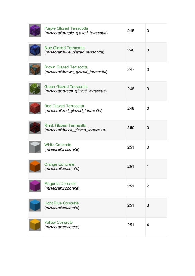 Например: id командного блока, id кварцевого блока, id изумрудного блока, id железного блока и id алмазного блока в Minecraft . Стоит отметить, что некоторые блоки имеют несколько значений .