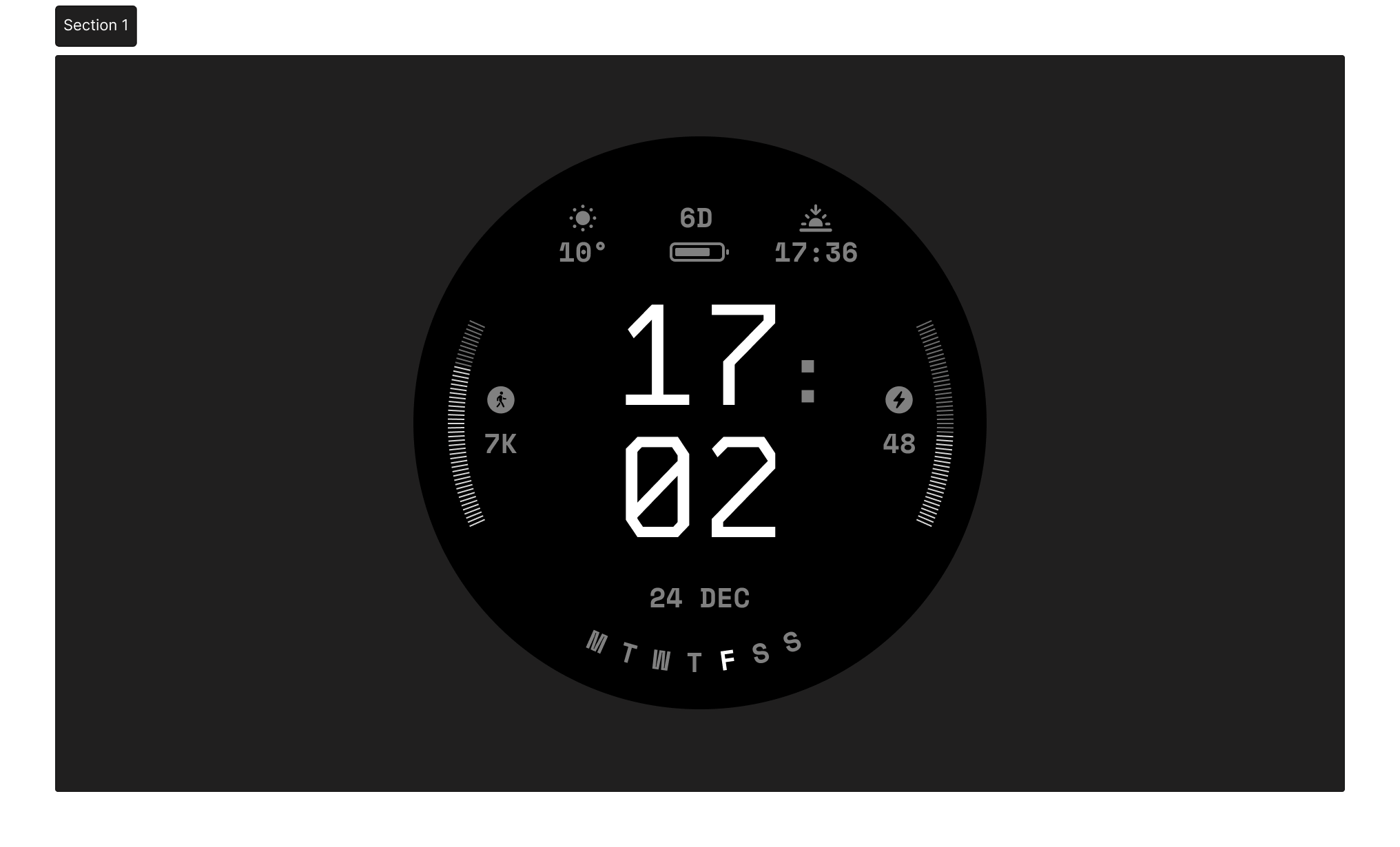 - Прогресс-бары, чтобы видеть цель и процент заполняемости (шаги, статус батарейки и тд). Часто в виде колец или полу-дуг, чтобы использовать по максимуму форму циферблата
