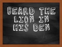 🧩 meaning: If you go to visit someone important in the place where they work, in order to challenge him/her or obtain something, you beard the lion in his den