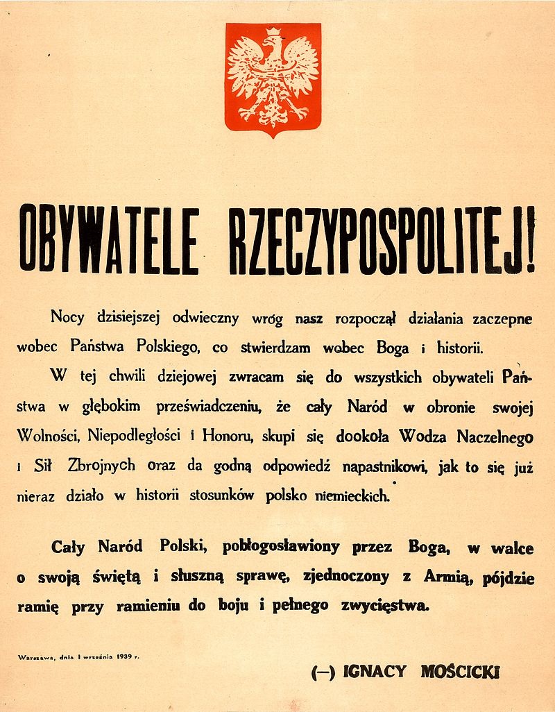 💼 После начала Второй Мировой войны, Ignacy Mościcki, согласно ст. 13 назначил своим преемником на посту президента Республики Польша Rydz-Śmigły. В связи с быстрым наступлением немецких войск Ignacy Mościcki был вынужден 8 сентября отправиться в Ołyki. Затем, 14 сентября, президент переехал в Załucz. 17 сентября до президента дошла информация о вступлении на территорию Польши частей Красной Армии. Было принято решение о необходимости пересечения границы с союзной Румынией. Moscicki пересек границу в Czeremoszu 17 сентября 1939 года в 21:45. На основании ст. 24-й Конституции, Ignacy Mościcki отправил в Париж (где был создан новый центр власти в эмиграции) запечатанный конверт с именем преемника. Оказалось, что им стал генерал Bolesław Wieniawę-Długoszowski, польский посол в Италии. Этот шаг вызвал недовольство эмигрантской оппозицией сосредоточенной вокруг генерала Władysława Sikorskiego, и французское правительство заявило, что не сможет признать Польское Правительство, назначенное генералом Wieniawę. В результате Moscicki назначил своим преемником Władysława Raczkiewicza. 30 сентября 1939 года в Bicaz, Ignacy Mościcki сложил свои полномочия.
