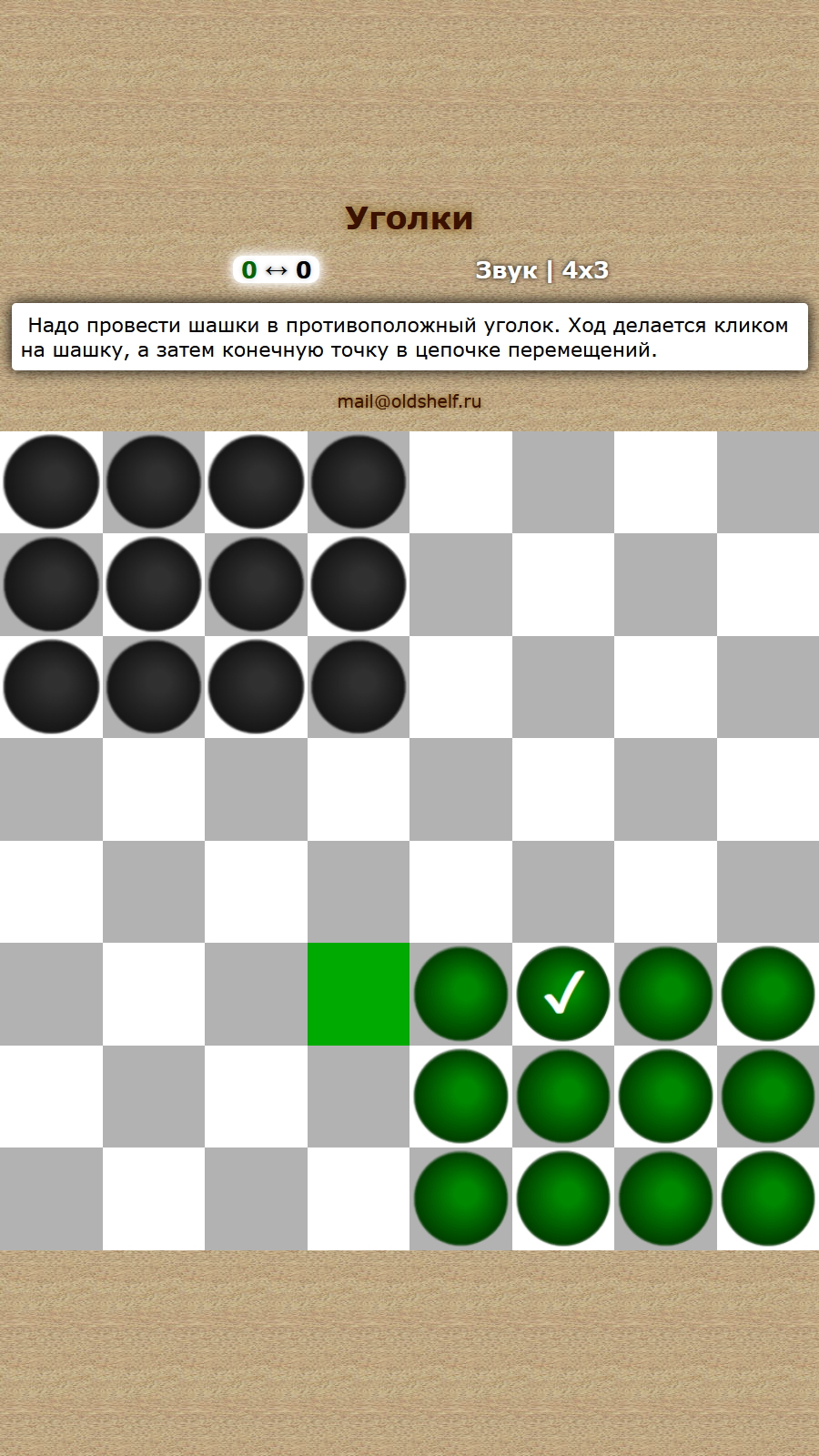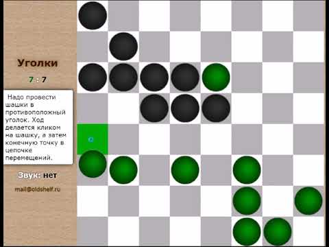Там же можно выбрать вариант игры: 3x3 (уголки из 9 шашек) или 4x3 (12 шашек) . В самом начале партии, до того, как сделан первый ход, можно выбрать другую сторону, кликнув на значок со стрелками (между счётчиками ходов, под надписью "Уголки") . без скачивания . бесплатные .