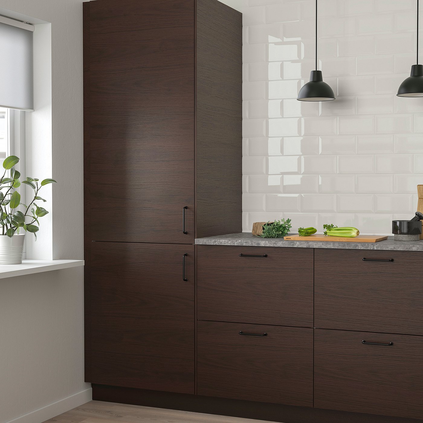 Удачные решения кухни под темный ясень . Фото подходящих фасадов, столешниц, ручек и кухонных моек с ценами . Дизайн кухонь с фасадами АСКЕРСУНД от специалистов ИКЕА .