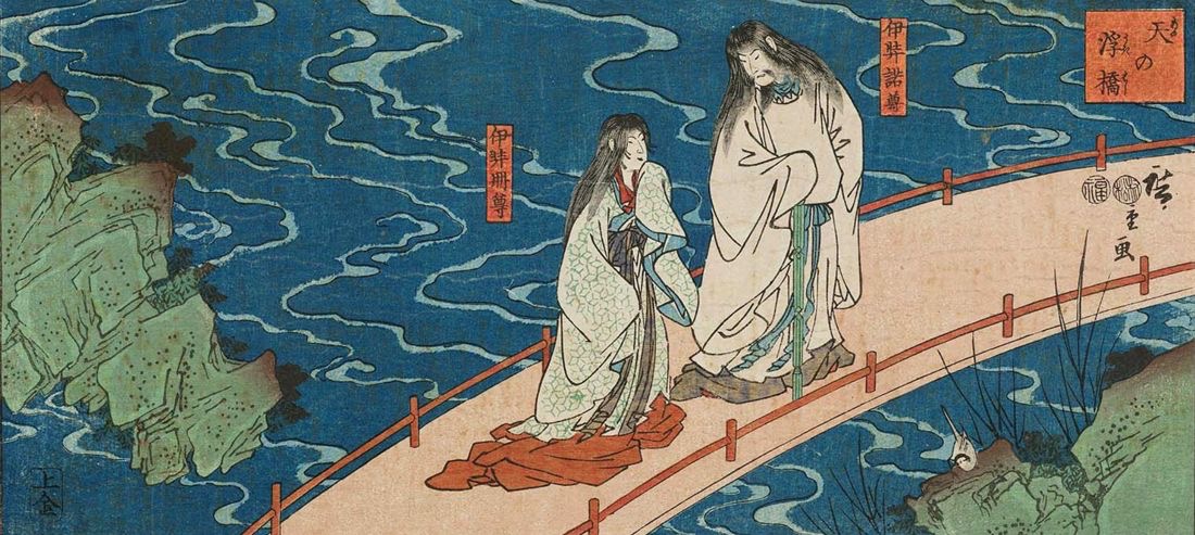 Un giorno, sulla piana del cielo, apparirono le prime divinità, che guardando in basso vedono il caos immerso nelle tenebre. Decidono quindi di chiedere a Izanagi e Izanami (fratello e sorella) di scendere in questo caos per creare qualcosa. Le due giovani divinità accettano, e fermatisi sul ponte dell'arcobaleno, immergono la lancia dei cieli nel caos melmoso. Iniziano così a crearsi dei grumi di melma sulla lancia, che cadendo da essa, andarono a formare gli otto gruppi di isole maggiori del Giappone.