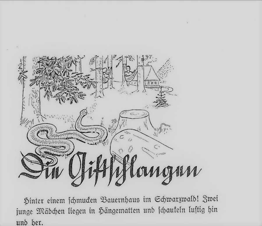 "Ora, ascoltate bambine! Avete davvero visto una vipera. È velenosa, pericolosa per gli animali come per le persone. Finché non c'è una preda nella zona, sembra tranquilla e innocua. Posso facilmente capire perché Inge credeva che non fosse pericoloso. Ma ricordate questo: mai fidarsi di un serpente! Dal momento in cui vede una preda, mostra la sua vera natura. Attacca senza pietà l'animale ignaro. Le sue zanne avvelenano il sangue della vittima".