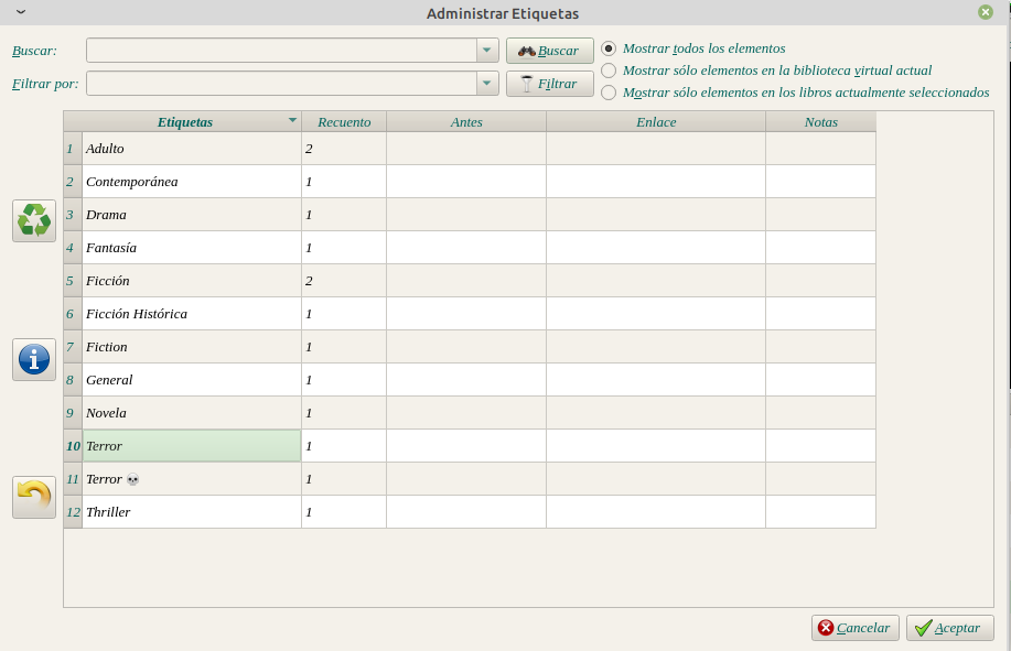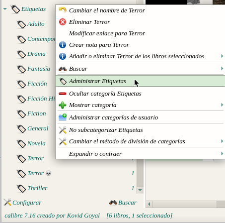 En este caso etiqueta de Terror, seleccionamos terror, botón derecho Administrar Etiquetas