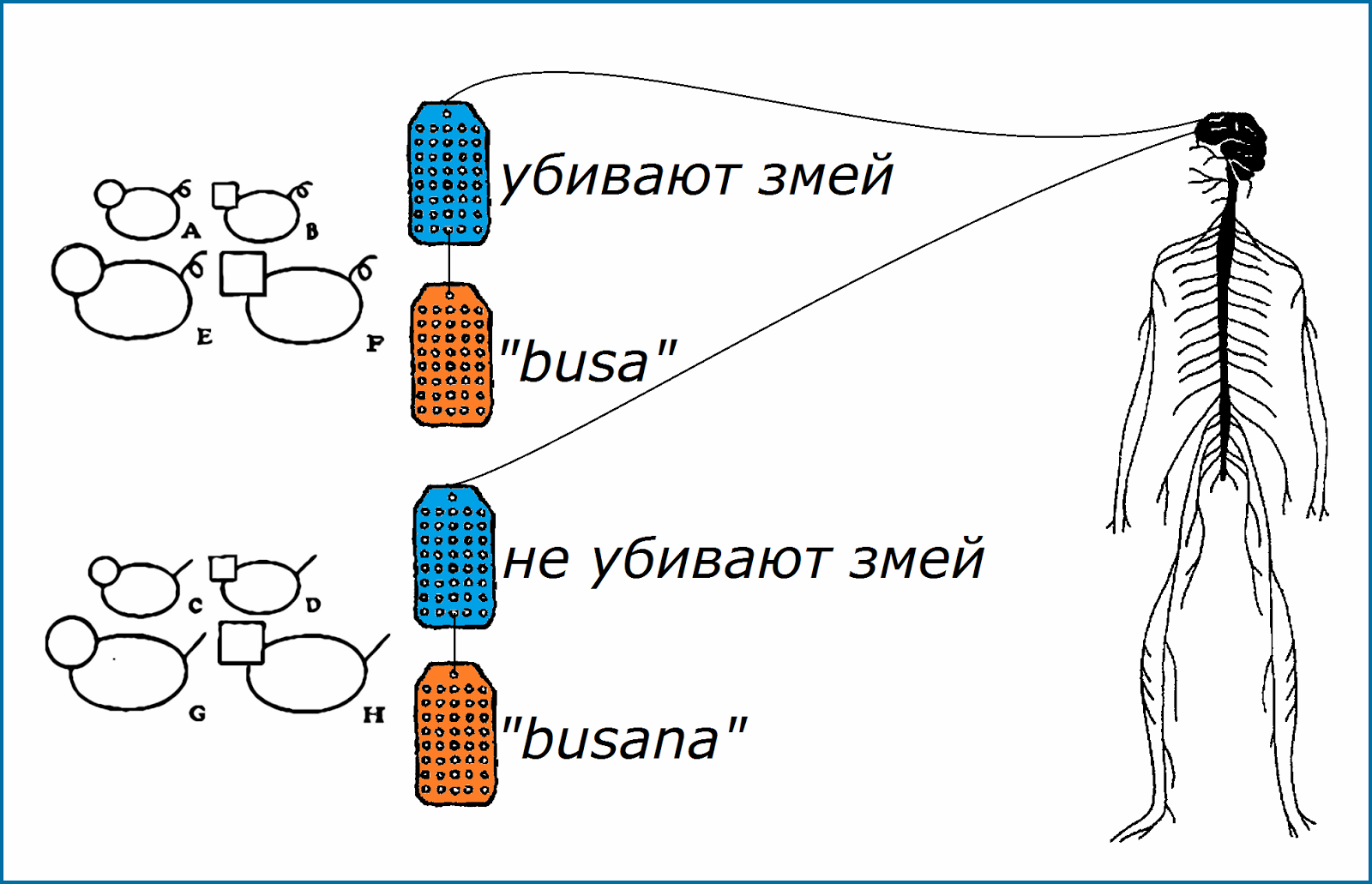 Ещё один сосед обнаружил, что животные со скрученными хвостами убивают змей, а с прямыми хвостами – нет. Он различает их, абстрагируя другой набор общих характеристик: A, B, E и F он называет busa, а C, D, G и H – busana.