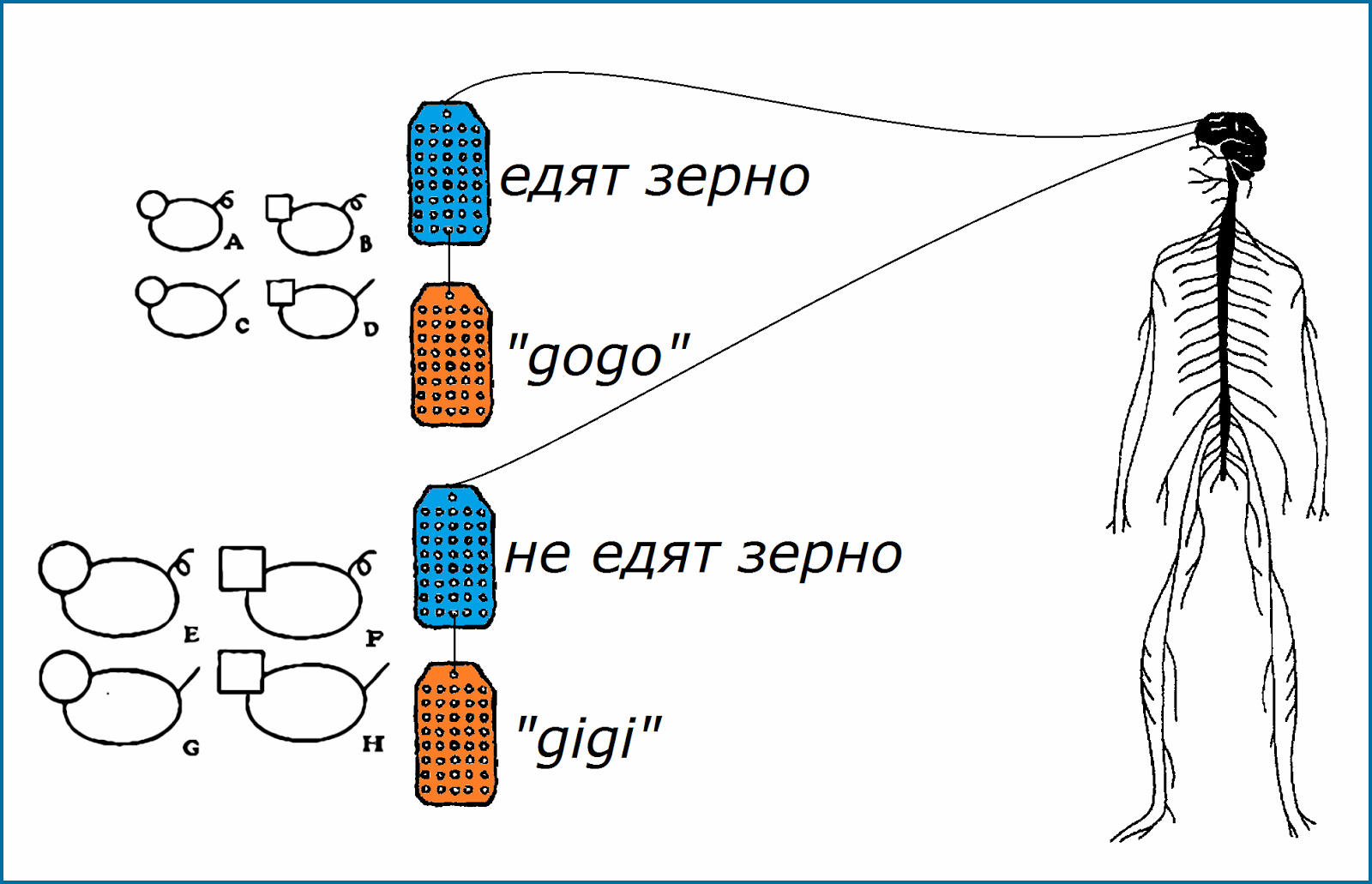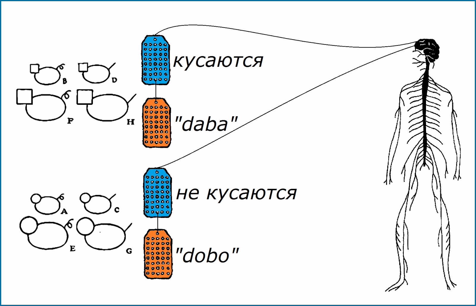 Однако у вашего соседа был другой опыт; он узнал, что животные с квадратными головами кусаются, а животные с круглыми головами не кусаются. Абстрагируя общие характеристики B, D, F и H, он называет их daba, а A, C, E и G он называет dobo.