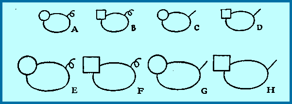 Общая семантика на русскомНа рисунке ниже изображено восемь объектов. Предположим, что это животные, среди которых четыре больших и четыре маленьких, четыре с круглыми головами и четыре с квадратными головами, и ещё четыре пары со скрученными и прямыми хвостами. Предположим, что эти животные бегают по вашей деревне, но так как вам пока нет до них дела, вы их игнорируете, и никак их не называете.