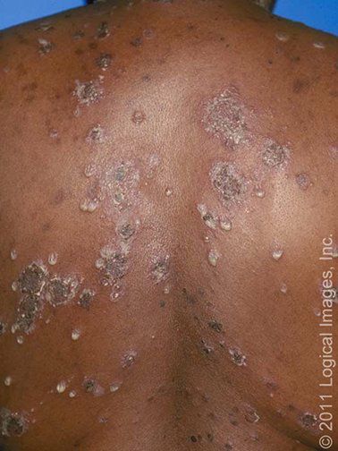 Bullous impetigo is a form of impetigo seen primarily in young children in which the vesicles enlarge to form flaccid bullae with clear yellow fluid, which later becomes darker and more turbid; ruptured bullae leave a thin brown crust. Usually there are fewer lesions than in nonbullous impetigo, and the trunk is more frequently affected. Bullous impetigo in an adult with appropriate demographic risk factors should prompt an investigation for previously undiagnosed HIV infection.